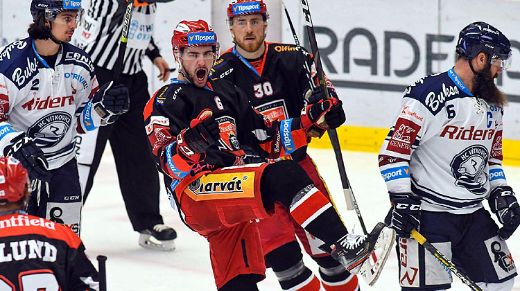 Branky: 15. Mallet (Dočekal) – 36. Cingel (Eklund, Lev), 38. Smoleňák (Eklund), 58. Smoleňák, 60. Smoleňák (Perret, Koukal). Rozhodčí: Pražák, Kubičík – Hlavatý, Tošenovjan. Vyloučení: 5:5, navíc Nedomlel (MHK) 10 minut osobní trest za naražení zezadu. Využití: 0:2. Diváci: 4 305. Střely na branku: 32:22